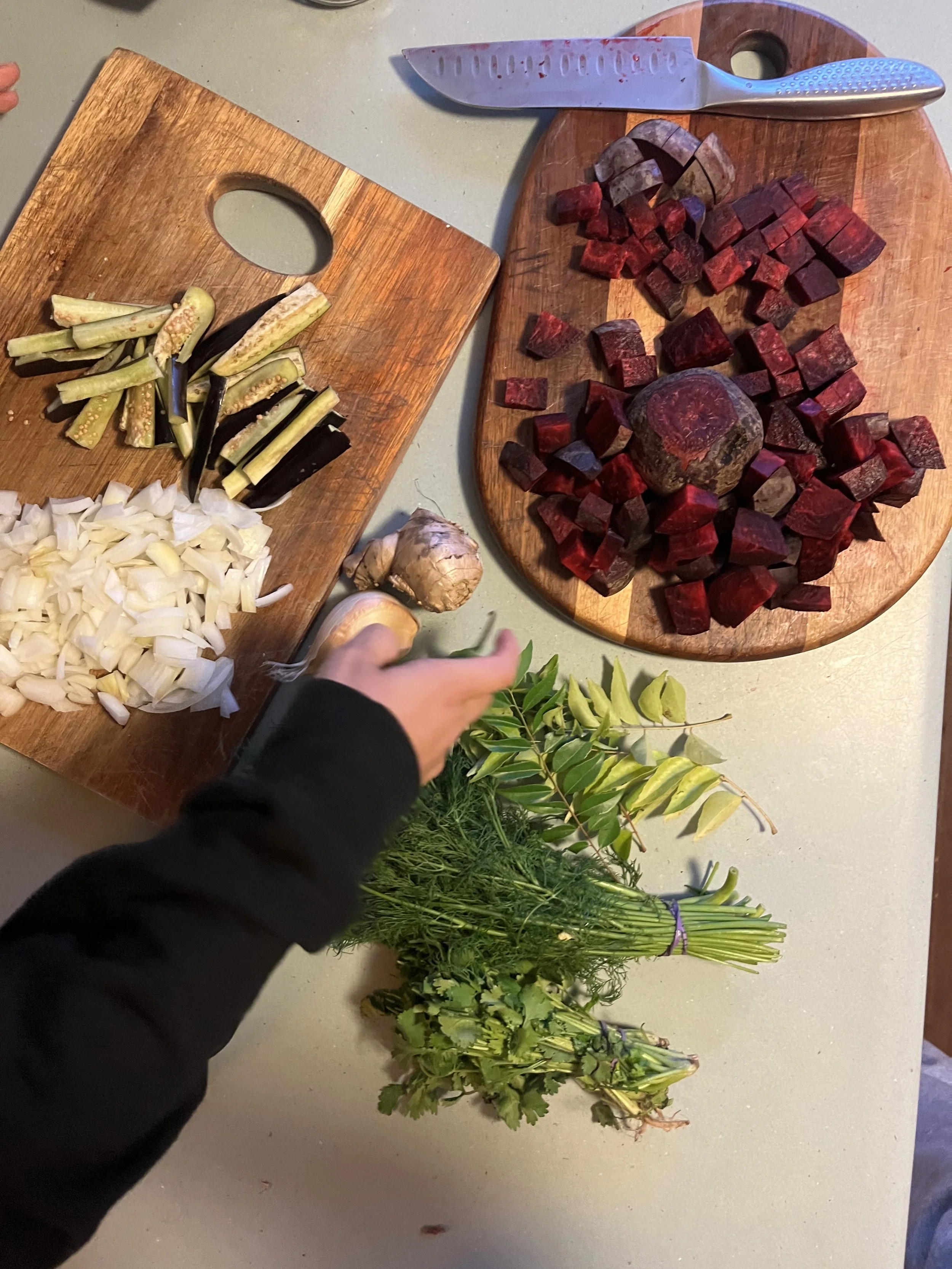 Cook off all spices until the cumin seeds start to pop. Add onion and stir together. After 3 or 4 minutes add the remaining veg and stir together. After 1 min add like a litre of water, maybe more. Probably more. Definitely covering all the veg and then some. Add lid, turn on low-medium heat and leave for approx. an hour.