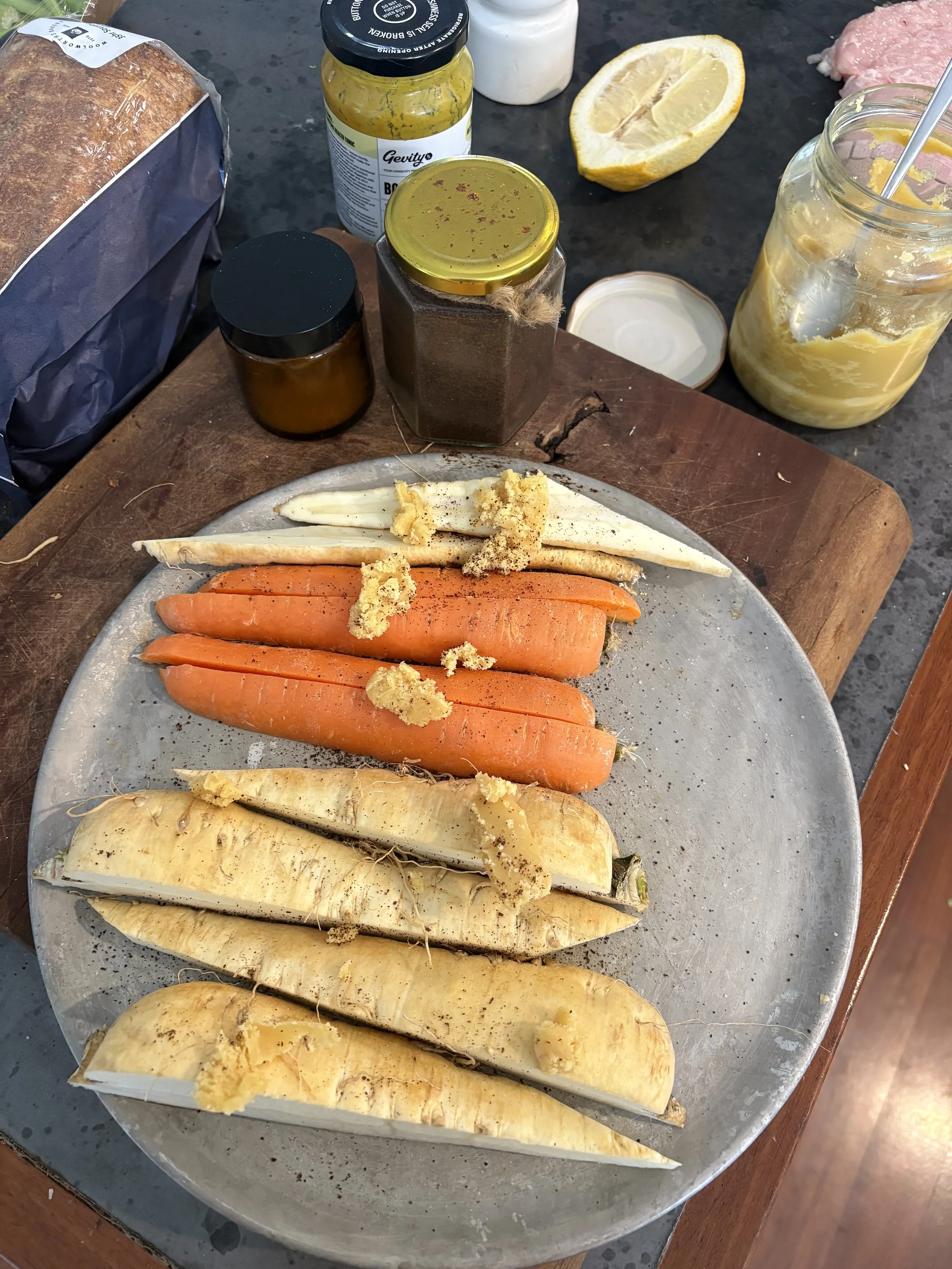 Cover in ghee or oil and roast on high like 180-200 celsius for approx 45min. Turn when each side starts to brown.