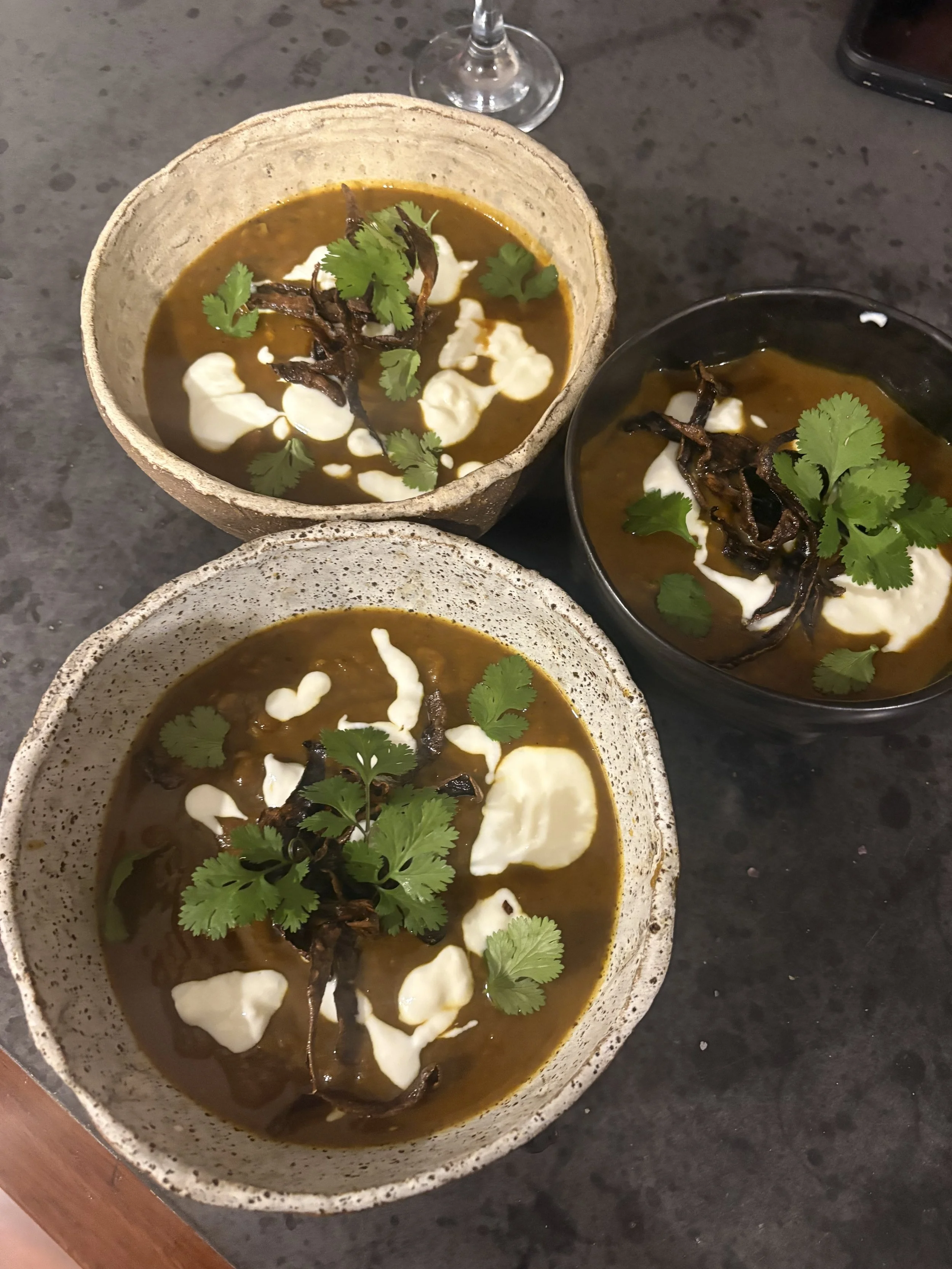 To serve, spoon daal into bowl, add a pinch of the s.potato skins, dress with a dollop of yoghurt if you want, a few leaves of coriander and a handsome fist-full of fresh lemon juice.